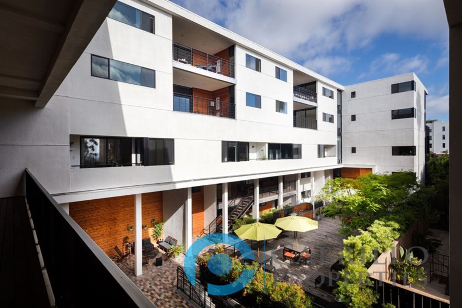 The Louie is further accentuated by a tranquil courtyard that features an outdoor kitchen with gourmet gas grill, multiple dining table sets with umbrellas, a sectional sofa covered by a large cantilever umbrella, a natural gas fire pit, sun loungers, and underground gated parking with bike storage.